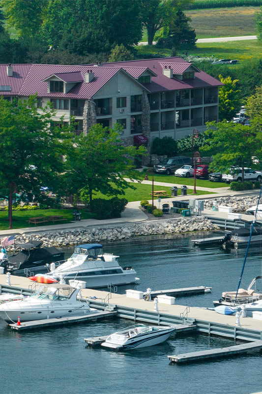 Door County hotels and lodges, ideal for large groups, sit alongside the shore as boats sail across the water.